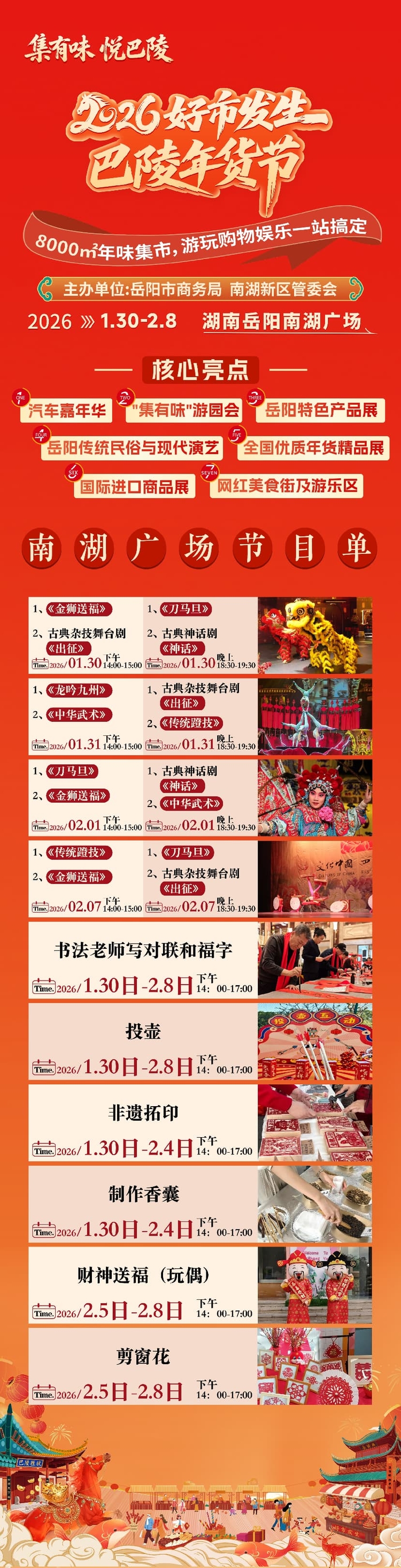 明日(1 月 30 日),备受瞩目的 “2026 好市发生・巴陵年货节” 将在岳阳南湖广场正式拉开帷幕!这场为期10天(1月30日-2月8日,腊月十二至腊月廿一)的年度消费盛宴,以 “集有味悦巴陵” 为主题,融合购物、文化、娱乐、体验多重维度,为市民打造一站式年货采购与新春休闲胜地,助力消费提质扩容,彰显岳阳城市魅力。
