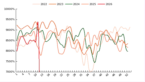 今年一季度,纯碱企业开工率维持在85%左右,随着新增产能的投放,纯碱产量持续走高,大幅高于去年同期水平。据隆众数据,2026年1-2月份,全国纯碱产量累计649万吨,同比增7.2%;其中重碱产量累计348万吨,同比增1.4%;轻碱产量累计302万吨,同比增14.9%。
