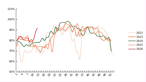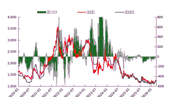 除上述重碱需求之外,一季度轻碱需求表现良好,整体需求稳中偏强,开工率基本在高位。根据华泰期货研究院推算,2026年1-2月,全国轻碱表需同比增长17.5%。具体来看,当前日用玻璃市场行情低迷,厂家开工负荷变动不大;泡花碱厂家开工8成左右,行业整体微利;焦亚硫酸钠行业开工负荷6成左右;两钠行业开工平稳,后续价格存上涨预期;本周味精行业开工负荷在87.4%,市场价格持续上涨;本周三聚磷酸钠厂家开工负荷稳定在18.36%,价格稳中有涨;小苏打厂家整体开工负荷提升至92%左右,市场价格波动不大。