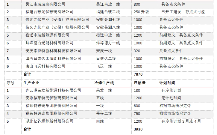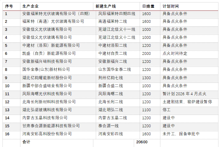 表 3:2026年光伏玻璃产线新建/复产/冷修计划